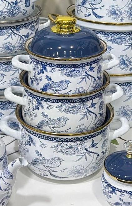 ست ۶ پارچه قابلمه لعابی طرح قلم آبی با کیفیت بالا مخصوص پخت و پز و شعله مستقیم بسیار با کیفیت با پایینترین قیمت در بهمن ماه 1404