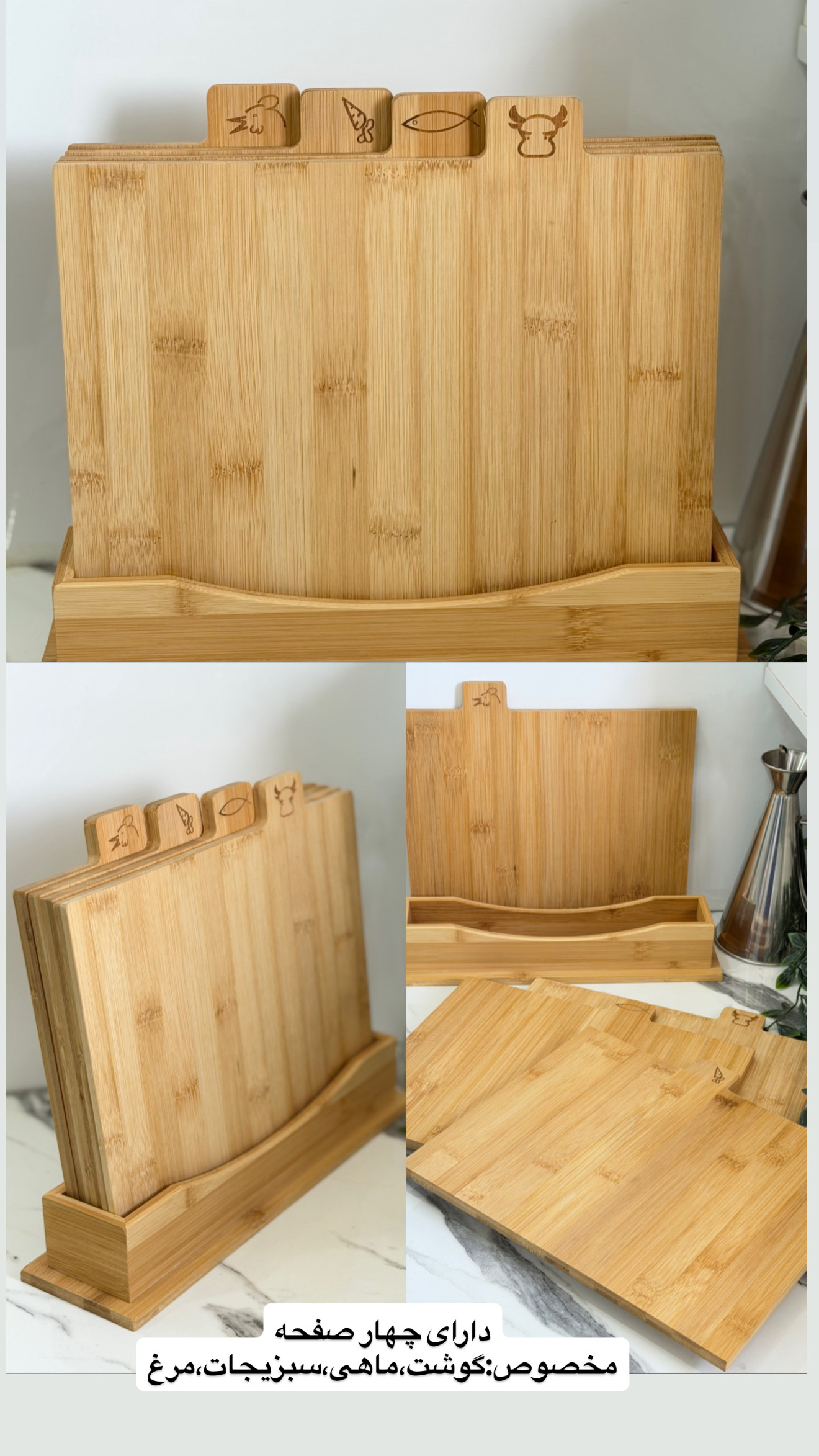 ست تخته سرو و خرد کن صد آب جدید همراه با نگهدارنده بسیار کاربردی جدید بامبو کیفیت عالی مخصوص چیدمان بهترین کیفیت و قیمت بهمن ۱۴۰۴